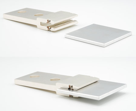 バスバー等の板材に挟みこむ形で接続するコネクタです。